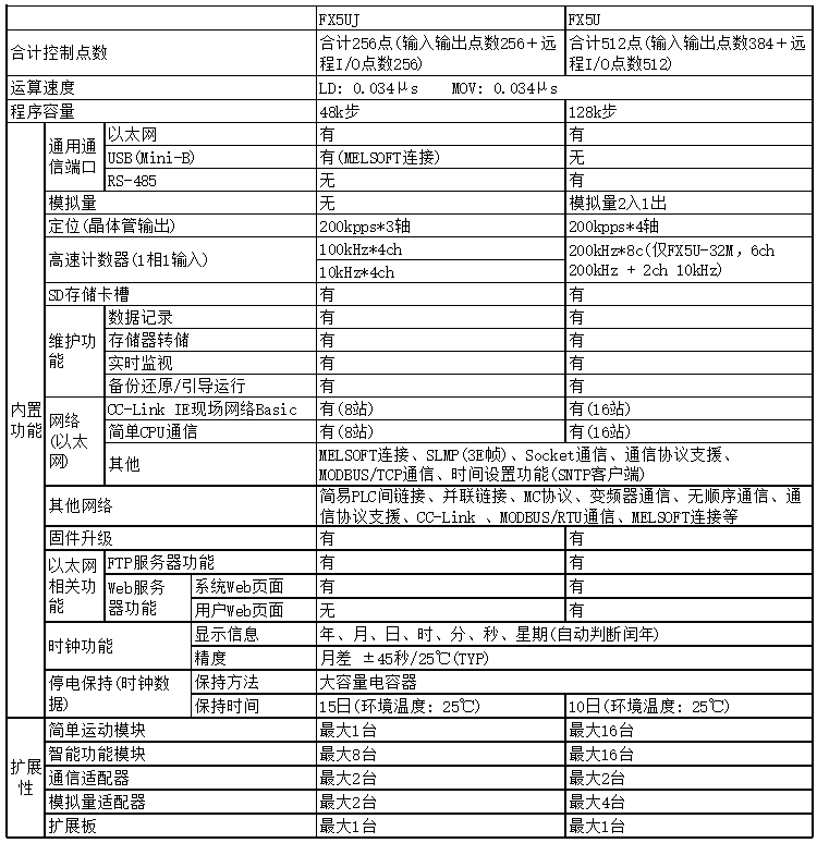 FX5UJ與FX5U系列CPU模塊的功能對比如下: