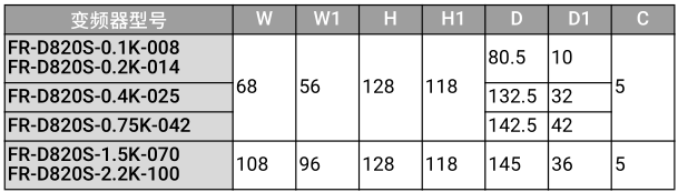 ·FR-D820-0.1K-O08、FR-D820-0.2K-014、FR-D820-0.4K-025、FR-D820-0.75K-042